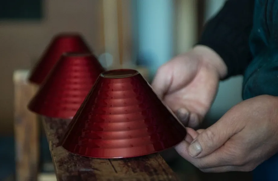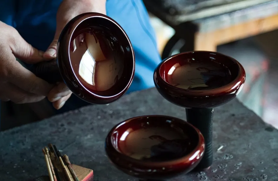 赤や緑の玉虫塗に仕上げます。まさに熟練の技が必要とされるのがこの上塗りの作業。湿度や温度に合わせて適切な調整をして、均一に色を塗っていきます。埃やゴミが付かぬよう、そして色むらができないよう、細心の注意を払って緻密な作業を繰り返します。木製の室(むろ)で一晩から1週間ほど、上塗りが落ち着くまで自然乾燥をします。