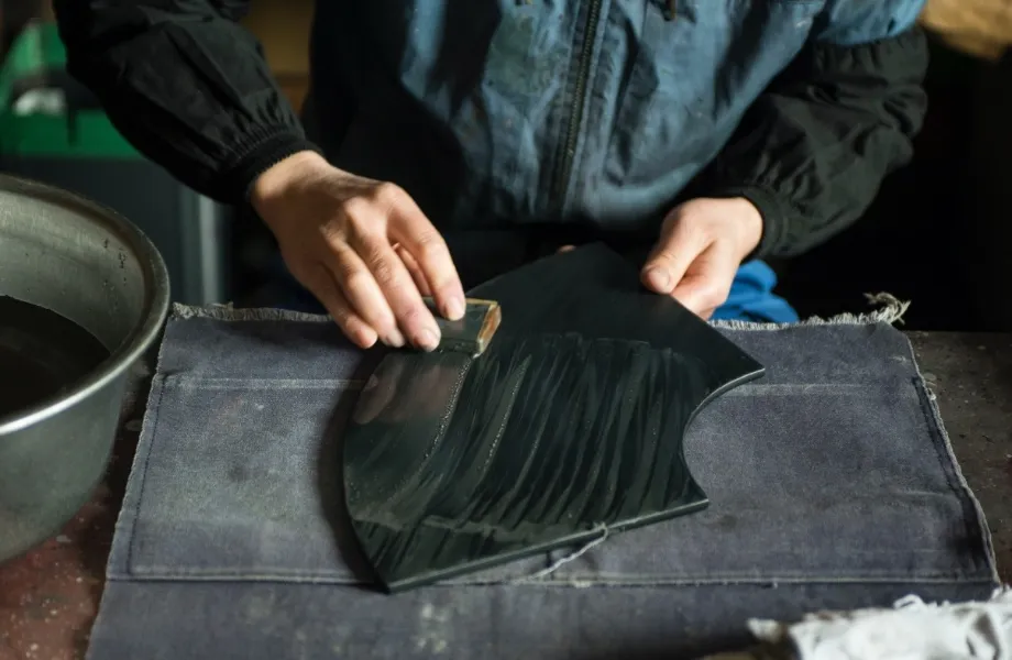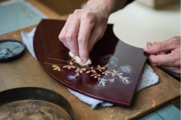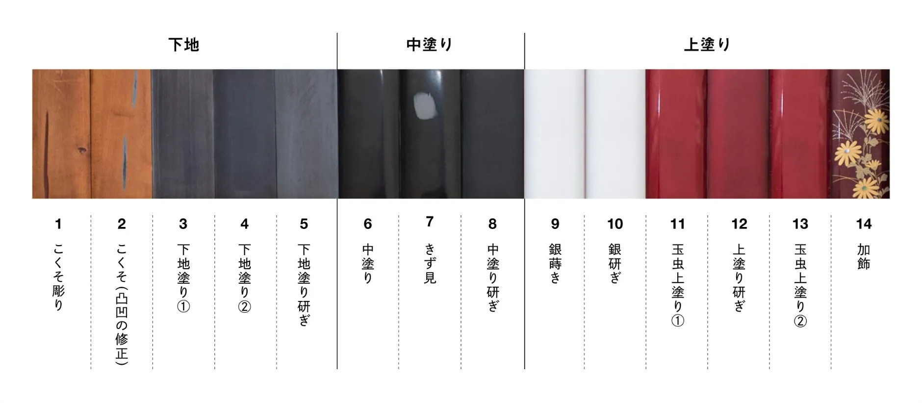 木や金属、ガラス、樹脂などでできた素地の凸凹や傷を、磨いたり削ったりを繰り返し、上塗りができる状態にします。塗っては研磨するという作業を繰り返して、表面を滑らかに強くしていきます。塗り物は下地で決まると言われるほど、重要な工程です。