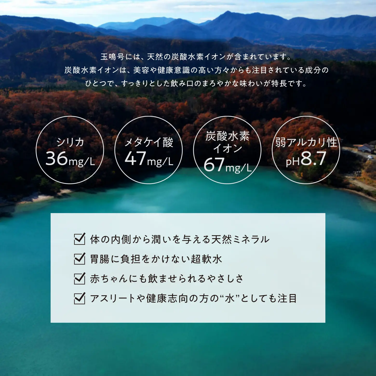 宮城県 鳴子温泉郷のひとつ、中山平温泉の地下1000mを水源とする温泉水。 鳴子火山の地層を形成する花崗岩に含まれる水分と、地球の中心部から上がってきたマグマ内のH2Oが混ざり、 地熱で温められて温泉水となって湧き出したのが玉鳴号です。 天然のイオン・ミネラルバランスにもすぐれた水として、古くから鳴子の人々に愛されています。