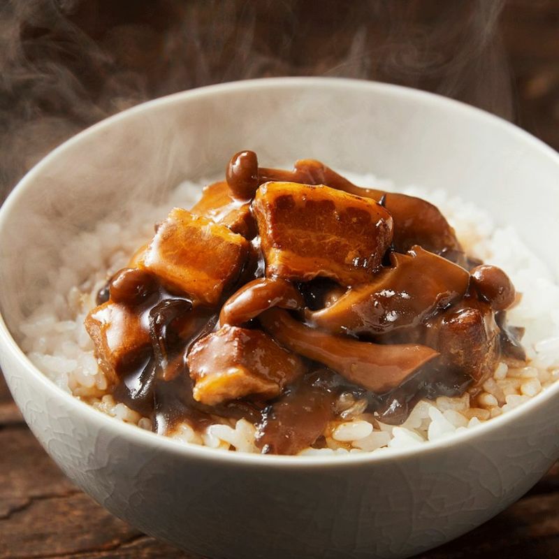 台湾のルーロー飯をお手本にして、豚バラと3種類のきのこをたっぷりと入れ、醤油と黒みつで甘辛いソースに仕上げました。ラーメンの具材にしたり、ゆで卵や半熟卵を乗せて食べるのもおすすめです。