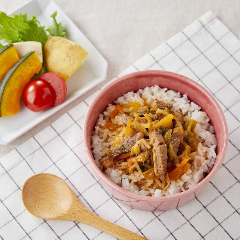 韓国のみそチゲをお手本にしました。コチュジャンと赤唐辛子、ごま油でみそのコクが引き立つ味に仕上げています。牛肉と五種類の野菜が入った具沢山で食べ応えのあるかけごはんの素です。