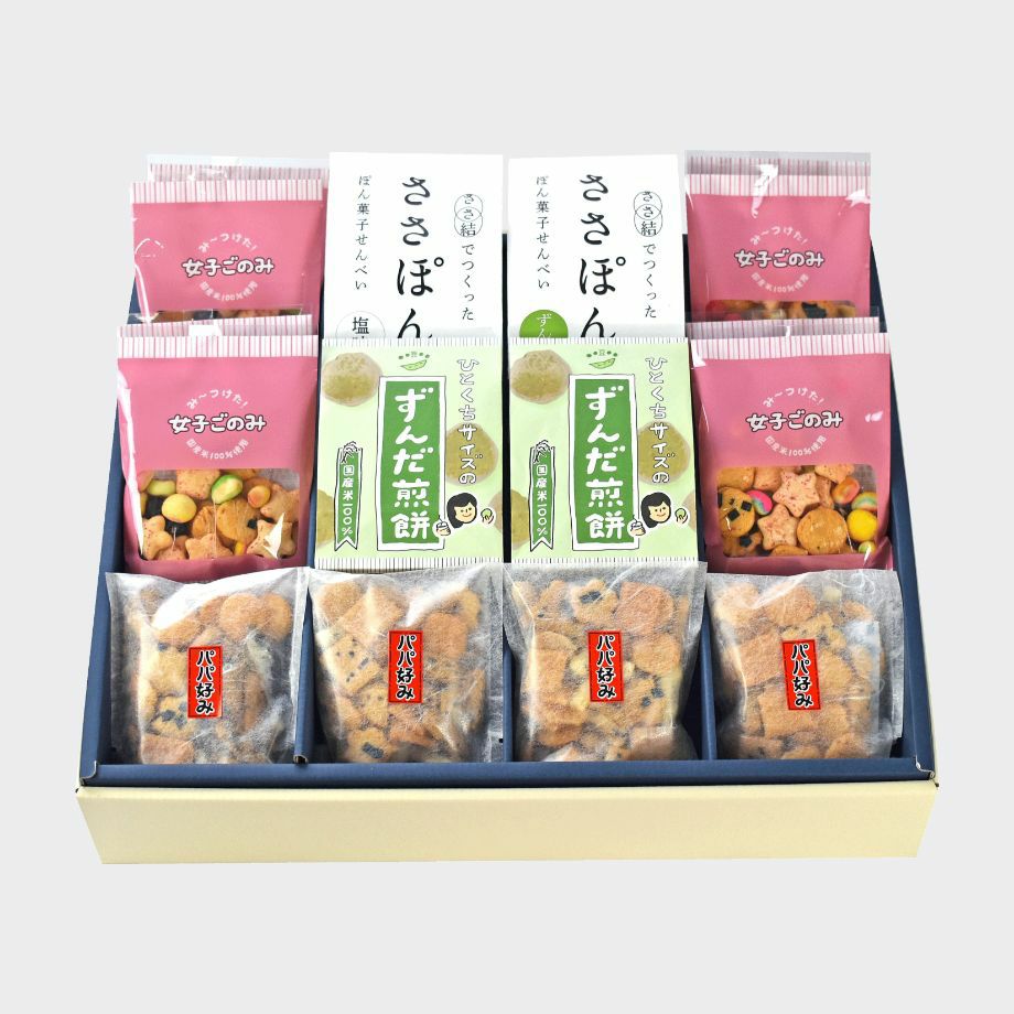他の画像を見る 人気商品のパパ好み 、 ひとくちサイズのずんだ煎餅 、女子ごのみ、ささぽん(塩味) 、 ささぽん(ずんだ味)を1箱で楽しめます。 松倉プレミアムギフトB 当店特別価格 ¥ 3,800 税込 詳細を見る お気に入りに登録する