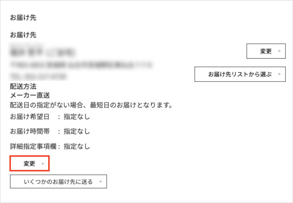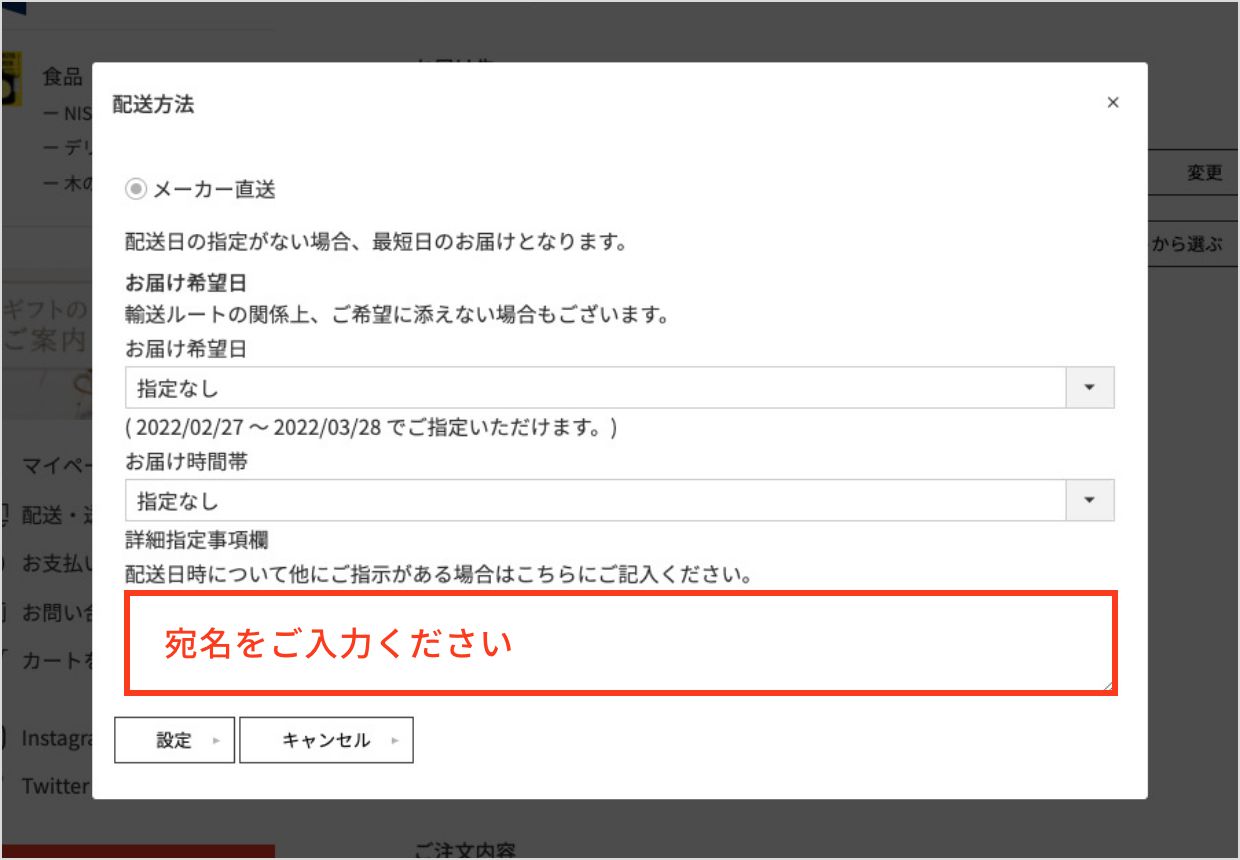 3)宛名を入れる場合は、お届け先の「変更」ボタンより、詳細指定事項欄にご入力ください。